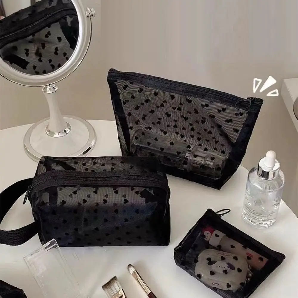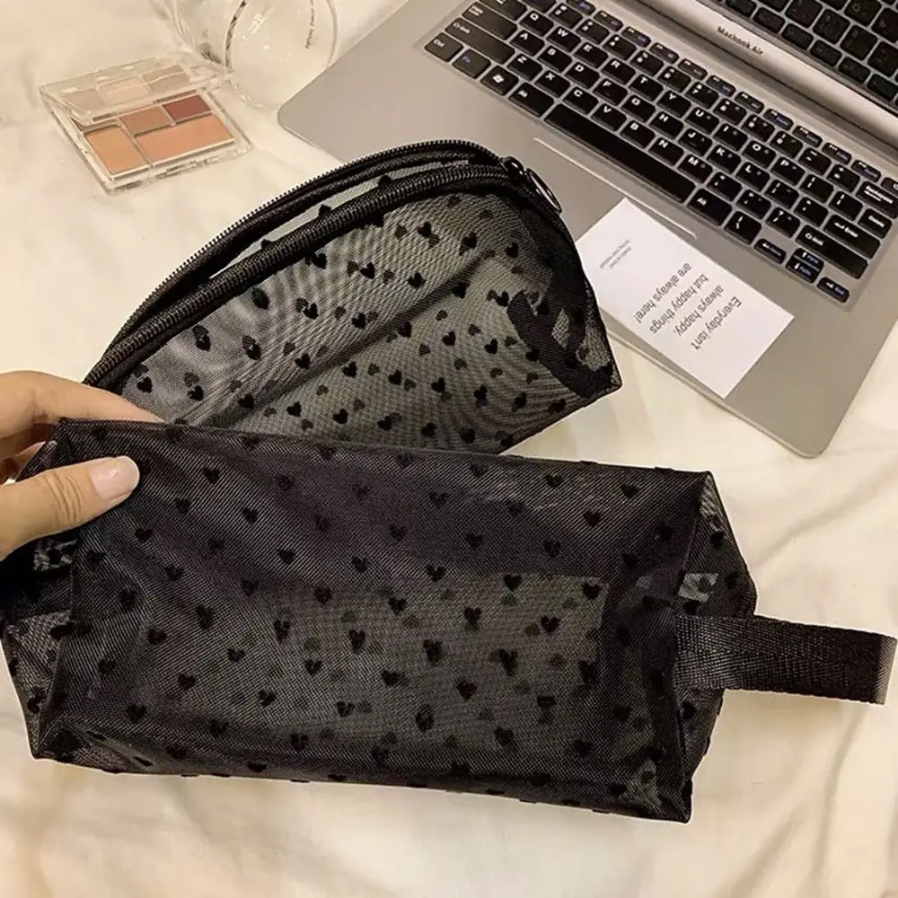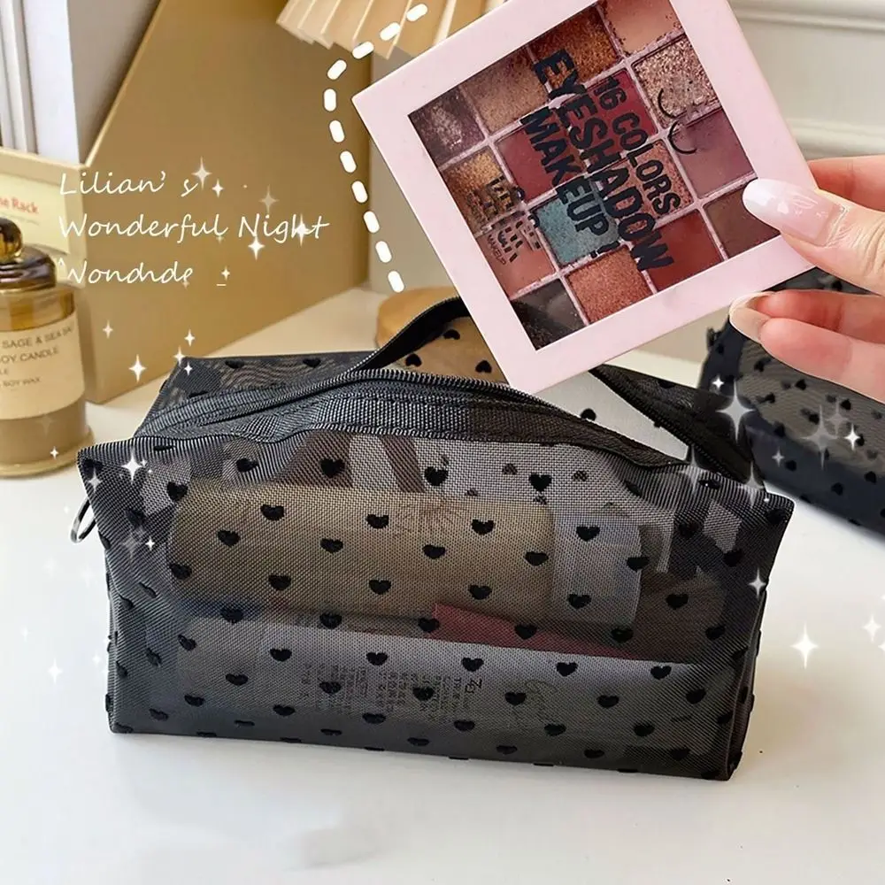 Heart Transparent Mesh Makeup Bag Multifunction Black/Pink Women Cosmetic Storage Pouch Portable Ladies Toiletry Storage Bag