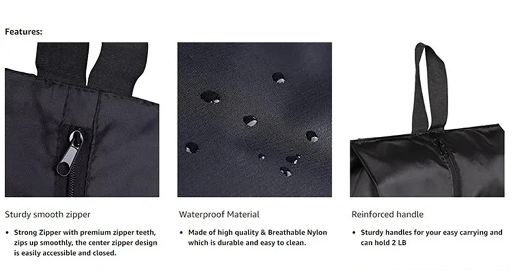 Lightweight and Waterproof fabric does a perfect job of packing shoes and keeping everything else clean. Also, with upgraded zippers which zips up smoothly and durable. The center zipper design makes it easy to get items in and out. Great shoe bags for dancing, playing basketball, tennis, golf, for gym and so on.